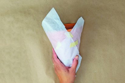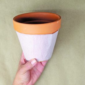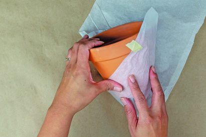 - Tape one end of the tissue paper to a clean terra cotta pot.