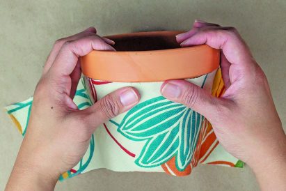 - Place the center of the fabric over the glue, and position it so it lines up with the bottom lip of the rim. Then, smooth it down onto the surface of the pot, to the bottom edge.