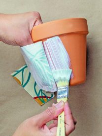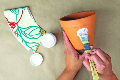 Dress up plain terra cotta pots by covering them with fabric, using a specially formulated decoupage glue for the outdoors, in which the glue will seal it and make it weatherproof. This project is perfect for using up fabric scraps, and the pots make great gifts for anyone who loves plants.