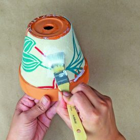 - Apply decoupage glue to the next section of the pot, position the next section of fabric onto the glue, and smooth it down. Repeat all the way around the pot.