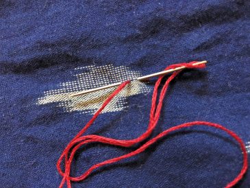 If you’re confident in your embroidery skills, you can add embellishment to the patch itself, as I did. If you choose to do so, it’s best done at the end of Step 2, just after you’ve cut out the patch. I worked embroidered designs on the patch fabric’s woven designs using a simple line of backstitch ending in a single loop of chain stitch.
